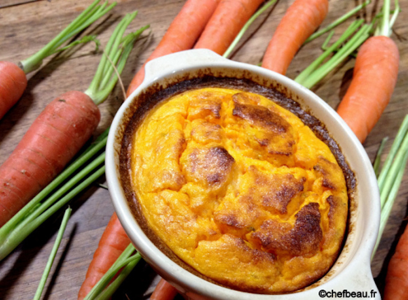Toute la petite famille s’est tournée récemment vers la carotte. Eh oui ! Le petit bonhomme commence à manger autre chose que du lait. Malheureusement, madame n’est pas une grande amatrice de ce légume orangé et sucré… Essayons de la réconcilier, c’est ce que je me suis dit. Mais il va falloir la relever, la parfumer. En plus, ça faisait longtemps que je voulais essayer ça… les soufflés de légumes.
