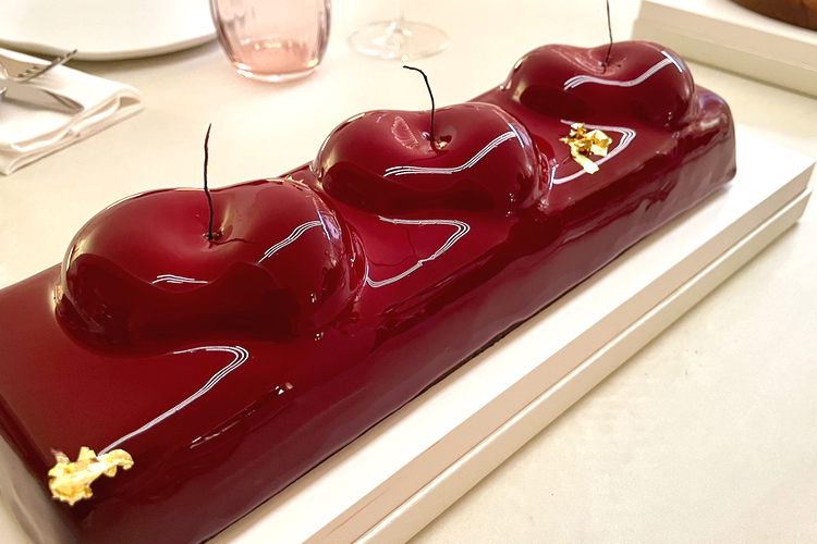 La bûche « Rouge Pantone 194 » de Yazid Ichemrahen adopte une forme allongée contemporaine, sobre, laissant la priorité à la lisibilité du produit. Le cœur aromatique est clairement identifié : griotte / cerise, associée à un chocolat noir intense. La structure repose sur un brownie (possiblement sans gluten selon les versions), un confit de griottes et une mousse chocolat. Le contraste acide–amer est central, avec une gourmandise maîtrisée qui évite l’excès de sucre. Certainement l’une des plus « chic » !